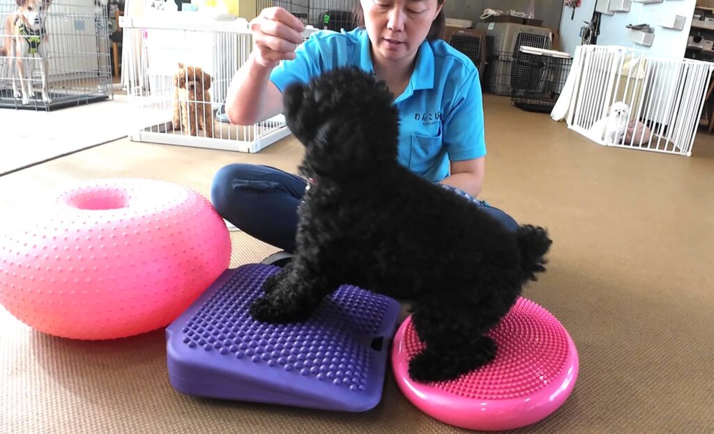 専用の室内スペースで行うため、天候に左右されず、いつでも安全に運動できるのが特徴です。バランスディスクやスロープなどを使い、楽しみながら体幹や筋力を鍛えられるよう工夫しています。